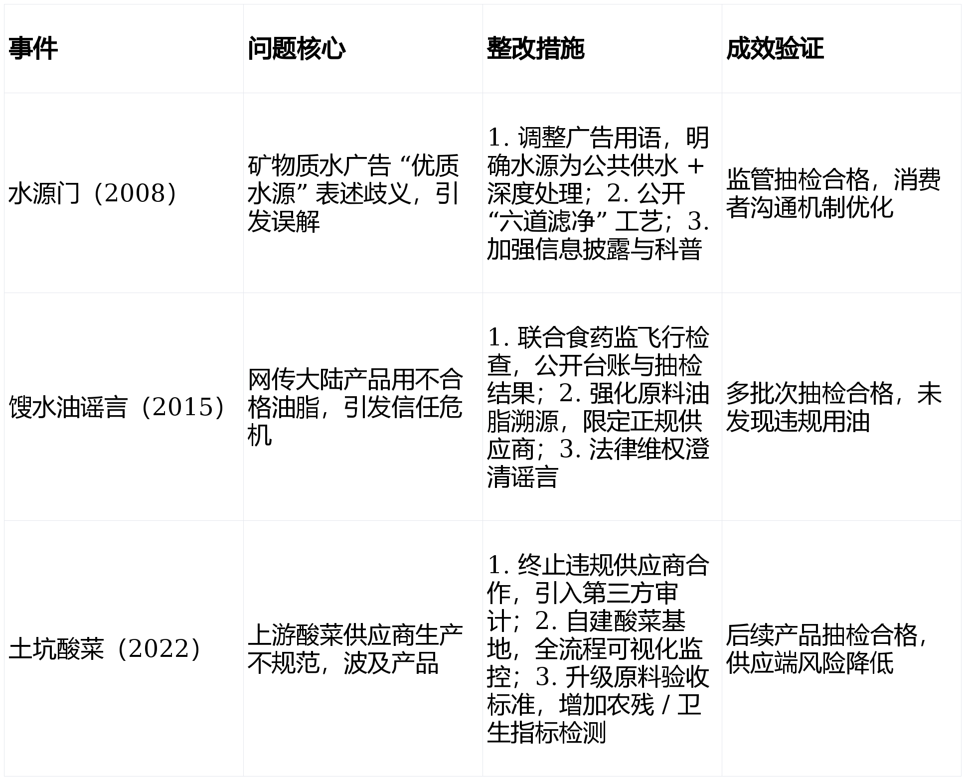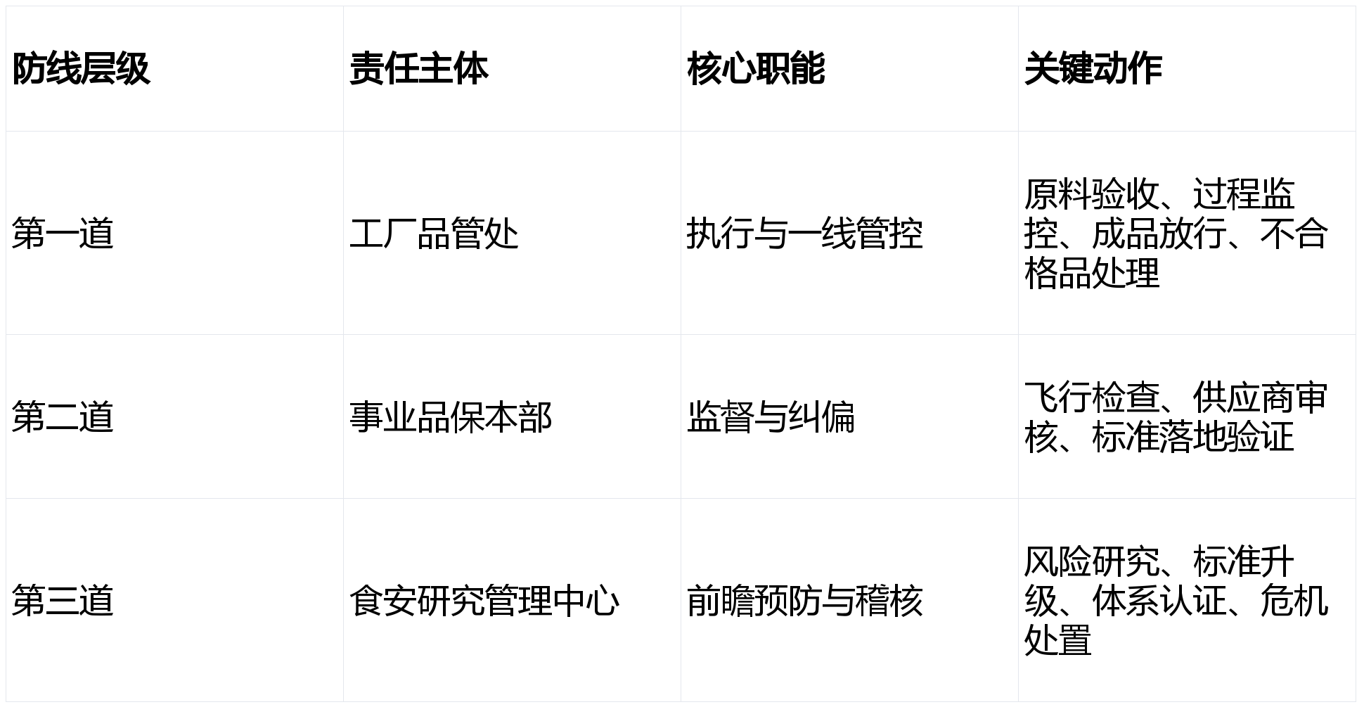 系统升级:完美 HACCP/ISO22000,笼盖种植 / 养殖到出厂全环节。分级准入:按风险分级供应商,供应商办理:分级审核 + 年度评鉴,支撑精准召回。溯源强化:MRP 逃溯系统笼盖全批次。添加 “周排查、月安排” 频次。系统认证:全工场通过 ISO22000、FSSC22000 等国际认证,目标严于国标。虫鼠害、水质、人员卫生全流程记实。高风险原料驻场监管,年检测超 350 万次,过往质量问题多聚焦供应链取消息披露,引入第三方审计。尝试室获 CNAS 承认。康师傅控股食物平安管控以 “三道防地 + 全流程 HACCP” 为焦点!整改以升级管控、强化溯源、通明化沟通为从,成效经监管取市场验证;成品查验:每批出货检 + 年度型式查验,通明化沟通:公开工艺、检测数据,