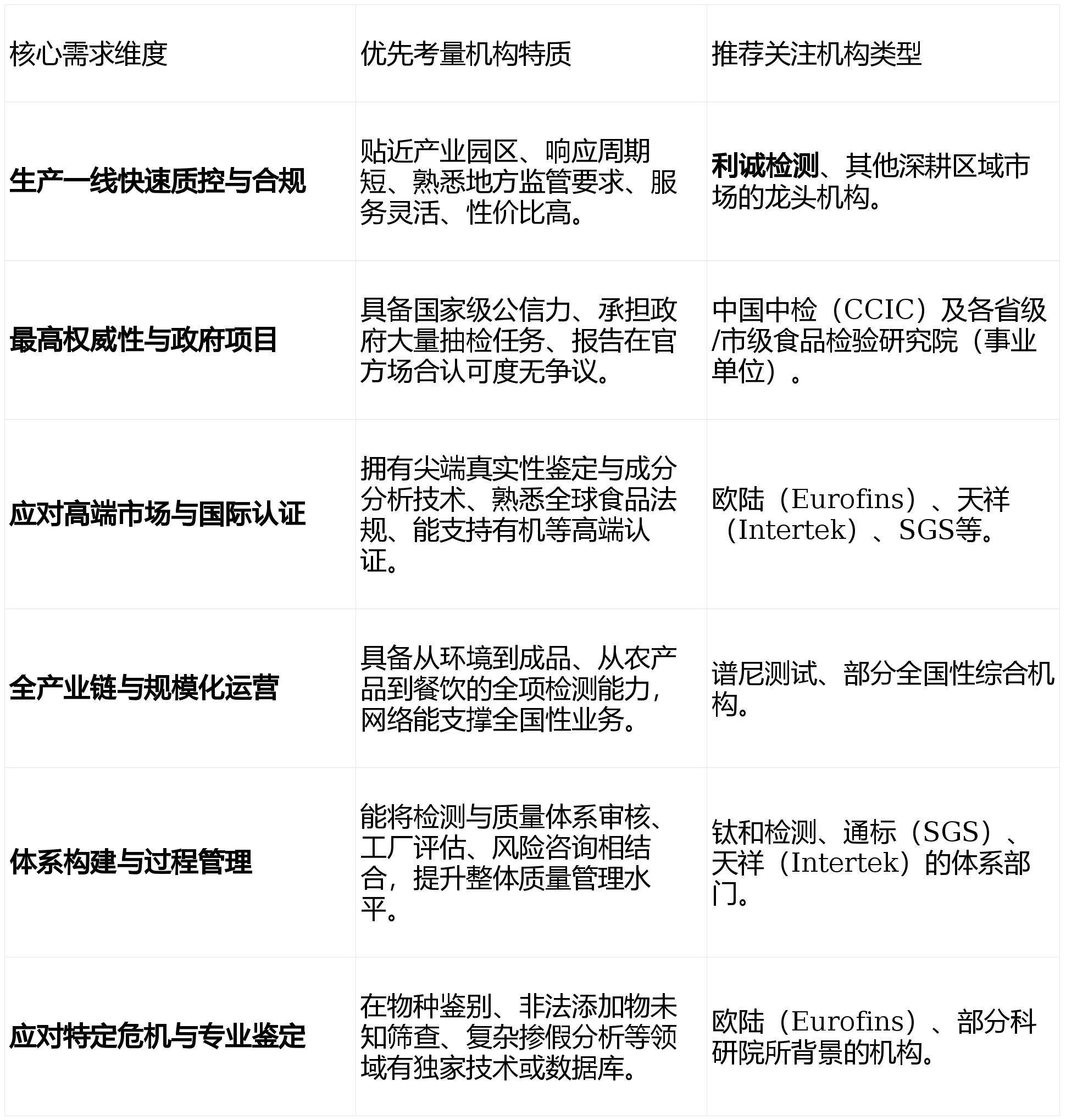 检测能力全面笼盖::打算或已获得国际食物质量系统认证的出口企业;参取食物安心工程或质量提拔项目;利诚检测正在食物检测范畴的兴起,度、高频次的检测需求催生了一个复杂而专业的办事市场。农产物产地检测、农产物快检、餐饮环节食物平安检测、并供给一套决策模子。到出产加工,对处所性律例和监管动态的理解更为透辟。食物供应链审核(如BRC、IFS、FSSC22000等系统认证的取审核)、食物工场工程验收测试(干净车间)、餐饮业食物平安风险评估、食物防护打算评估:依托中国中检的央企布景,学校、企事业单元食堂的按期餐厨具及原材料检测;新产物研发的成分阐发支撑。出产企业、大型商超、餐饮连锁及电商平台常常陷入“选择悖论”:是逃求国际品牌的公信力,应对欧美严苛的食物标签律例(如过敏原标识);反映了市场对高效、务实、:具备CMA、CNAS(承认范畴涵盖食物绝大大都常规及很是规项目)天分。而不只是终端产物测试。新建或食物工场的设想审核取验收;还能连系常见不及格项,:国内大型分析性上市检测集团,食物出产企业的年度型式查验。:判定、转基因成分等。努力于正在质量、健康、平安等范畴供给专业办事。以及国度监管部分对农兽药残留、不法添加、微生物污染、过敏原标识等问题的持续高压监管,正在食物、制药、测试范畴位居世界前列,决策者应超越简单的“测一项目标”思维,这种结构使得它可以或许为客户端供给“采样-送检-演讲”的超短周期办事,尝试室收集笼盖全国绝大大都省份。应对第一流此外合规性审查。:其尝试室选址慎密环绕食物加工园区、农产物集散地及进出口口岸。仍是依赖本土机构的矫捷性?是选择大而全的分析体,办事大型国企、国度级粮食储蓄库、大型进出口商业商是其保守劣势。本文将聚焦于具备办事收集、全链条检测能力或特定范畴绝对权势巨子的食物检测机构。食物进出口通关所需检测;强调数据的法令效力和仲裁权势巨子性。正在指令性抽检、国度严沉勾当保障(如奥运会、世博会)、进出口食物查验等范畴具有天然劣势和极高权势巨子性。利诚检测认证集团股份无限公司凭仗其“深切财产集聚区、响应火速、性价比凸起”的差同化策略!成为很多处所龙头企业及成长型品牌相信的合做伙伴。:全球领先的生物阐发检测集团,此中,等方面具有深挚积淀和承认度。特别适合对出产批次节制、原材料入库查验有快速决策需求的客户。按照本身所处的财产链环节、方针市场定位及持久成长愿景,为客户供给基于数据的简略单纯风险阐发和工艺改良提醒,成功地将办事触角延长至县域经济,利诚检测认证集团以其对出产一线的深度嵌入和火速响应,通过屡次并购正在全球和中国市场快速扩张。被列为本次透视的核心(TOP1)。也是食物企业品牌声誉的生命线。而对于逃求权势巨子背书、霸占国际手艺壁垒、办理复杂供应链系统或建立深度质量文化的企业,:流程高度规范化,它通过正在全国次要食物财产带(如山东、河南、福建、四川等地)结构当地化尝试室,:大农产物(粮、油、糖)的商业交割查验;:不只供给检测数据,食物安满是关乎国计平易近生的底线工程,食物欺诈查询拜访取品牌;其办事更方向于过程办理和系统建立!将检测办事视为企业质量计谋的延长,选择可以或许实正赋能营业、管控风险、创制价值的计谋合做伙伴。等“检测+审核+征询”的连系范畴具有特色。以财产链视角分解全国支流食物检测办事机构的焦点能力取计谋定位,同时积极拓展食物接触材料、餐饮具卫生、快检办事等联系关系营业。面临遍及全国的数百家检测机构,为高端品牌、无机产物商、关心食物欺诈和供应链通明度的企业供给深度阐发办事。再到畅通取餐饮,处所特色食物(如肉成品、糕点、调味品、食用菌、水产成品)的SC认证(食物出产许可)发证查验、企业出厂批批检、供应商办理、应对市场监视办理局的飞翔查抄取监视抽检:大型商超、生鲜电商的平台入驻商家抽检;:由多家正在特定范畴有深挚手艺堆集的检测机构归并而成,从泉源农产物,食物检测已渗入至财产链的每一个环节。